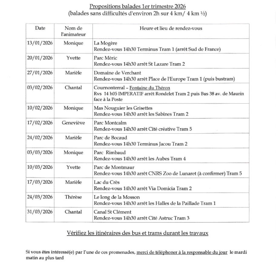 Parking 1:Géant Casino Celleneuve, entre l'av. de la liberté et Feu vert Tram: Ligne 3 Bus : Ligne 10 et 15Parking 2: Casino rond-point de la Lyre à hauteur des pompes à essence Tram: ligne 1 arrêt « Euromédecine » Bus: Ligne 6 arrêt vers Euromédecine - arrêt « route de Ganges » Parking 3:Casino - Prés d’Arène côté cafétéria Tram: Ligne 4 arrêt « Garcia Lorca » Bus : Ligne 16 vers Tournezy - arrêt « Mas d’ArgeliersPour répondre à la demande de certain(es) adhérent(es) qui souhaitent marcher une après-midi seulement, pour des raisons de bien être ou de disponibilité, nous proposons une sortie que nous appellerons « ballade proximité santé » (marcher, s’aérer, admirer la nature) autour de Montpellier sans faire trop de kilomètres et partagerdesmomentsdeconvivialité.Durée: entre 2h et 2h30 en fonction de la saison, du temps, de notre humeur !!Heure de Rdv: 14h30Covoiturage: 2 €