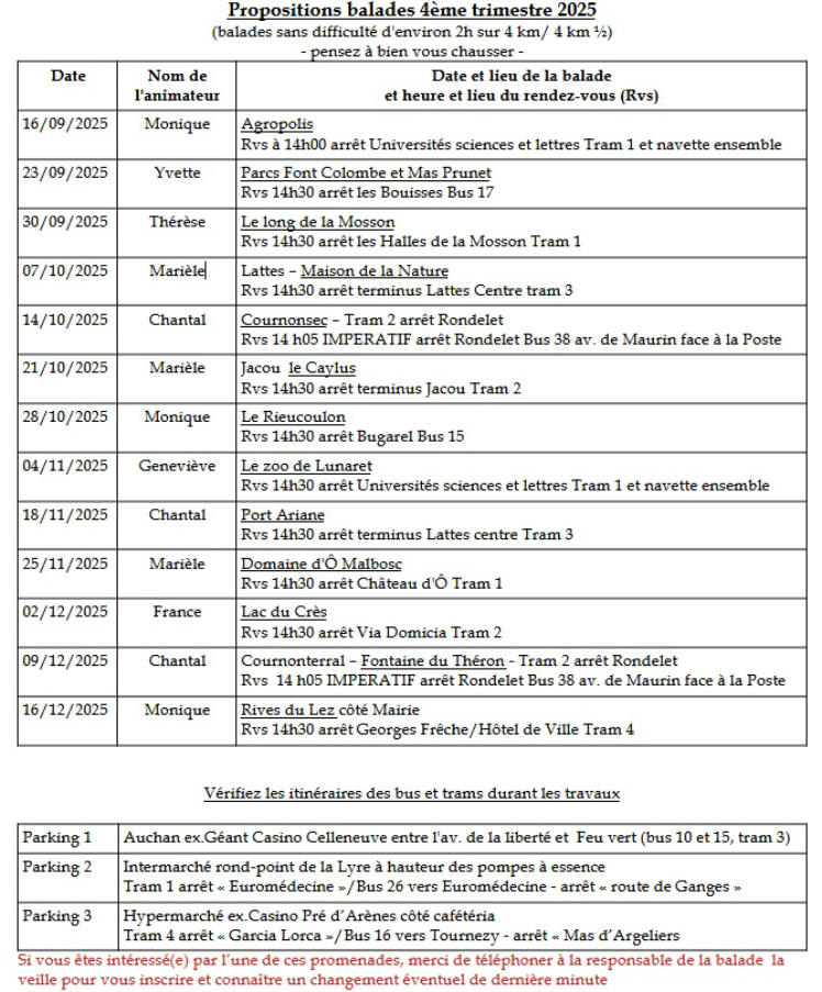 Parking 1:Géant Casino Celleneuve, entre l'av. de la liberté et Feu vert Tram: Ligne 3 Bus : Ligne 10 et 15Parking 2: Casino rond-point de la Lyre à hauteur des pompes à essence Tram: ligne 1 arrêt « Euromédecine » Bus: Ligne 6 arrêt vers Euromédecine - arrêt « route de Ganges » Parking 3:Casino - Prés d’Arène côté cafétéria Tram: Ligne 4 arrêt « Garcia Lorca » Bus : Ligne 16 vers Tournezy - arrêt « Mas d’ArgeliersPour répondre à la demande de certain(es) adhérent(es) qui souhaitent marcher une après-midi seulement, pour des raisons de bien être ou de disponibilité, nous proposons une sortie que nous appellerons « ballade proximité santé » (marcher, s’aérer, admirer la nature) autour de Montpellier sans faire trop de kilomètres et partagerdesmomentsdeconvivialité.Durée: entre 2h et 2h30 en fonction de la saison, du temps, de notre humeur !!Heure de Rdv: 14h30Covoiturage: 2 €